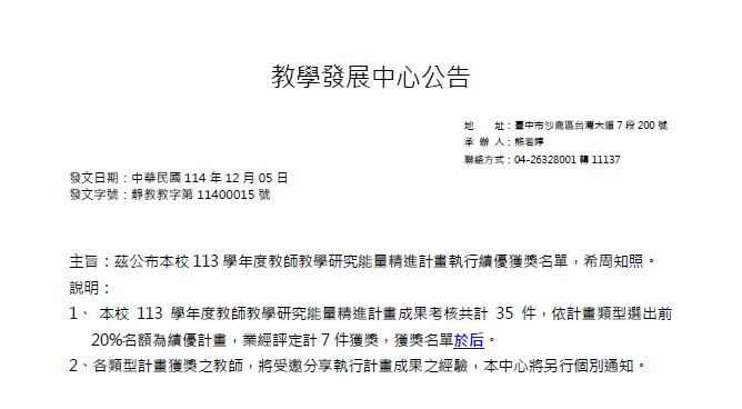 【獲獎公告】113學年度教師教學研究能量精進計畫執行績優獲獎名單,恭喜獲獎教師!